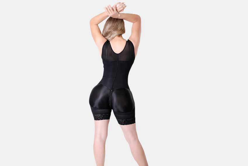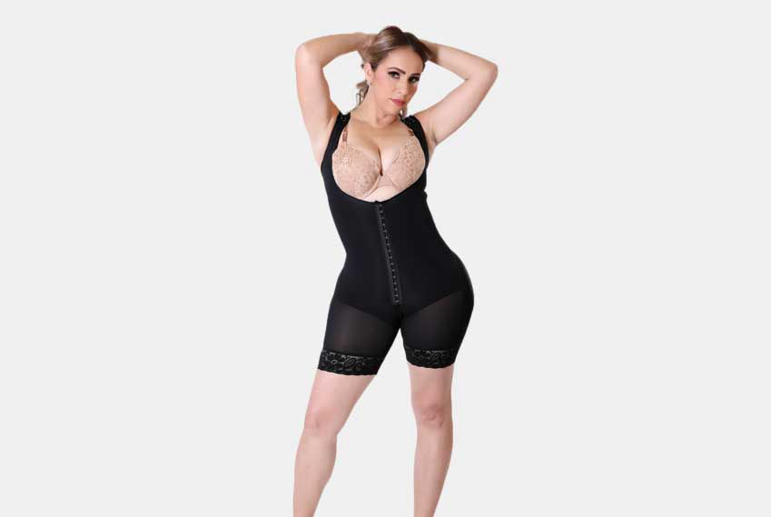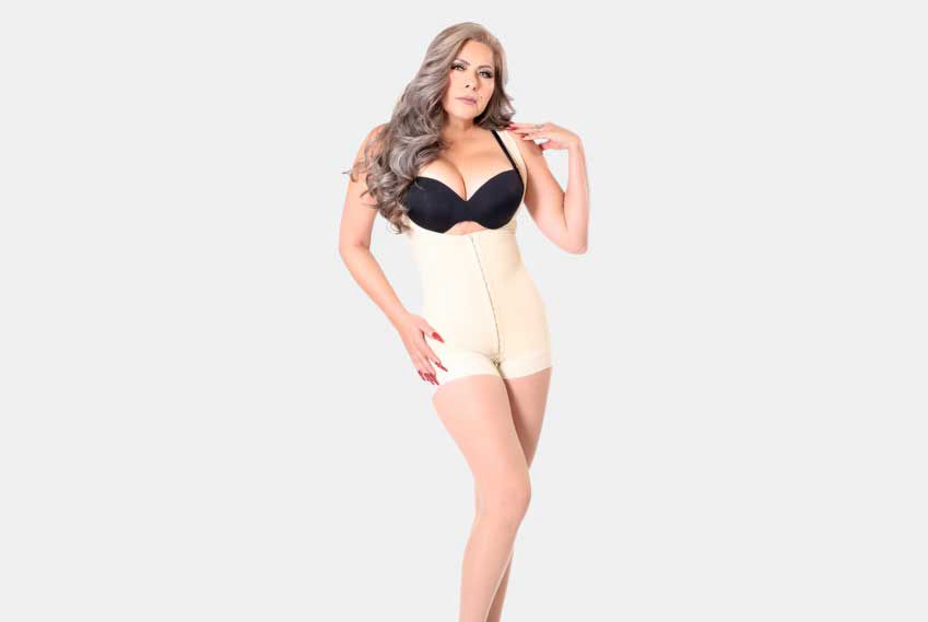 Senos libres a media pierna. Tela alta compresión, forro algodón, cintura reloj de arena, glúteos corazón de durazno, zíper perineal, tirantes ajustables, post-quirúrgicas.